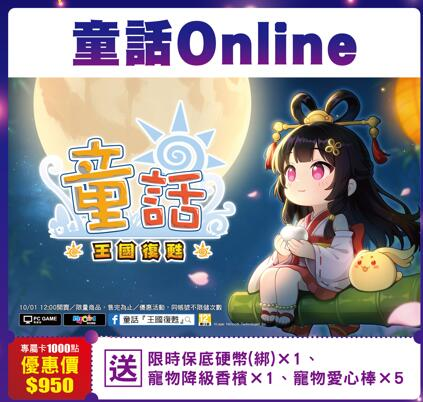 於指定活動期間內,至e-PLAY特約門市購買指定《童話Online》專屬卡1000點,除可享95折優惠外,直接儲值至指定遊戲的遊戲帳號內,將可獲得獎勵『限時保底硬幣(綁)x1、寵物降級香檳x1、寵物愛心棒x5』回饋。