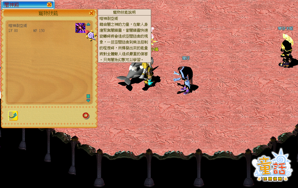 藉由闇之神的力量,在敵人身邊聚集闇精靈,當闇精靈快速旋轉時將會造成空間扭曲的現象,一旦空間扭曲到無法控制的程度時,所爆發出來的能量將對全體敵人造成嚴重的傷害。只有闇系幻獸可以學習。 |