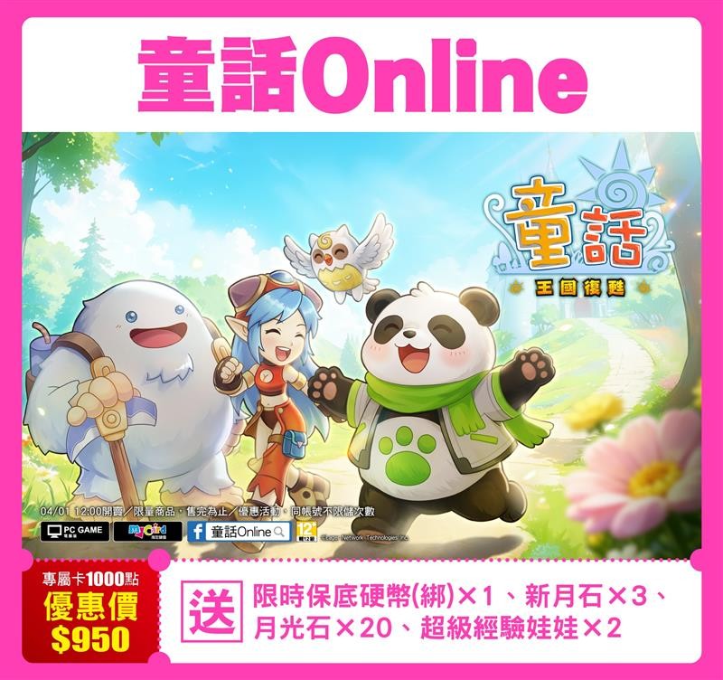 於指定活動期間內,至e-PLAY特約門市購買指定《童話Online》專屬卡1000點,除可享95折優惠外,直接儲值至指定遊戲的遊戲帳號內,將可獲得獎勵『限時保底硬幣(綁)x1、新月石x3、月光石x20、超級經驗娃娃x2』回饋。